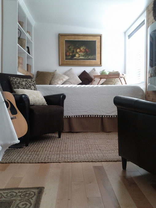 A guest room was needed here, and the task was next to impossible because the budget was VERY tight. We shopped second hand and found treasures. The door, wooden blinds, shutters, stained glass windows and large mirror were all from Habitat. The only thing new, beside the building materials was the wall mounted fire place from Costco.